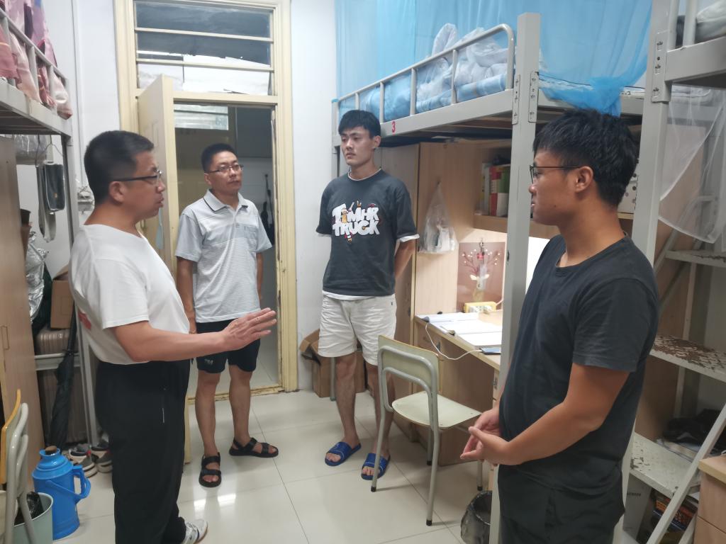 走访中,老师们都仔细询问考研复习、科研实习、生活等状况,认真聆听同学们的建议和意见,不时提醒同学们要信守留宿承诺,遵守暑期留校相关规定,严格落实学生宿舍“六个严禁”要求;不下水游泳、不到河湖水塘游玩;绷紧疫情防控之弦,严格遵守疫情防控要求,做好个人防护,积极主动配合核酸检测,严格执行请销假制度。每到一个宿舍,老师们都提醒同学们要认真复习,为研究生初试取得好成绩奠定坚实基础。走访中,对发现的个别宿舍安全隐患,老师们当面批评教育并要求学生立即整改。
