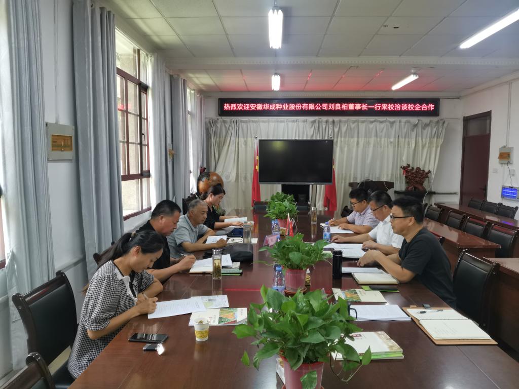 为更好地培养国家紧缺应用型种业人才,充分发挥校企联合办学优势,8月9日上午,安徽华成种业股份有限公司党支部书记、董事长刘良柏等一行4人到农学院洽谈“华成种子班”筹办事宜。农学院党委书记何世潮,副院长舒英杰、李文阳参加交流洽谈。