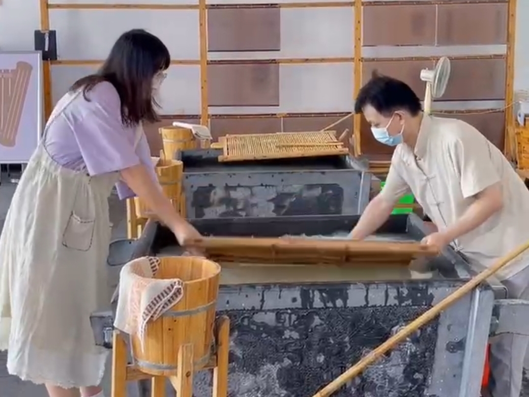 7月27日,团队成员到达宣城市泾县的中国宣纸文化园,参观了中国宣纸博物馆,了解宣纸的发展历史、制作原料、制作工艺。随后,团队成员参观了制作现场,亲身感受到宣纸制作工艺的精妙与不易,在与工作人员的交谈中了解了宣纸文化的创新发展现状和前景。