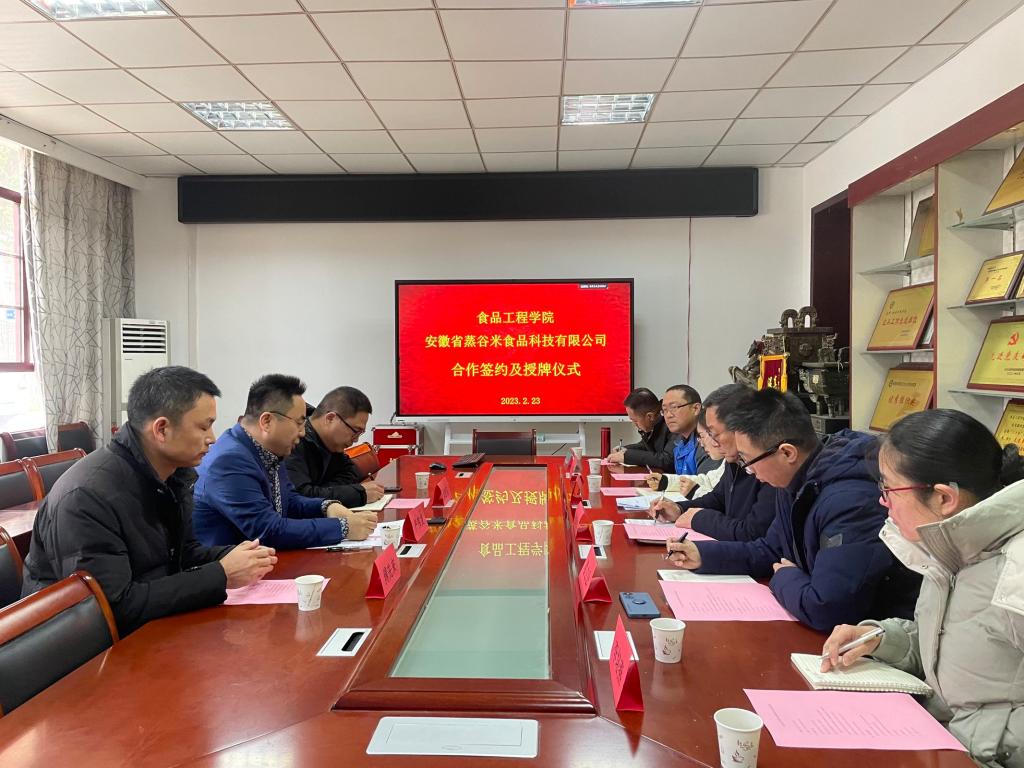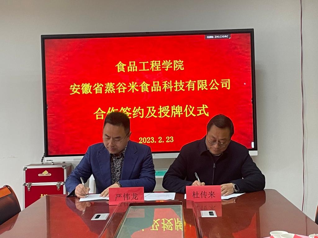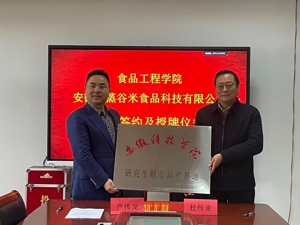 会议最后,在与会人员的见证下,校企双方领导共同签订校企合作协议,同时为安徽蒸谷米食品科技有限公司研究生联合培养基地进行授牌,并合影留念。