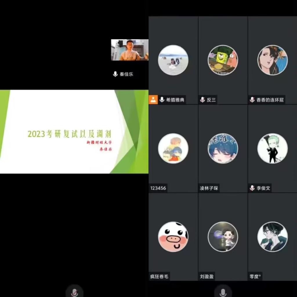 新疆财经大学在读硕士、2022届国贸专业毕业生秦佳乐结合自己研究生报考过程中的调剂和面试经历进行分享。就同学们关心的英语面试、调剂小程序的应用等作了交流。