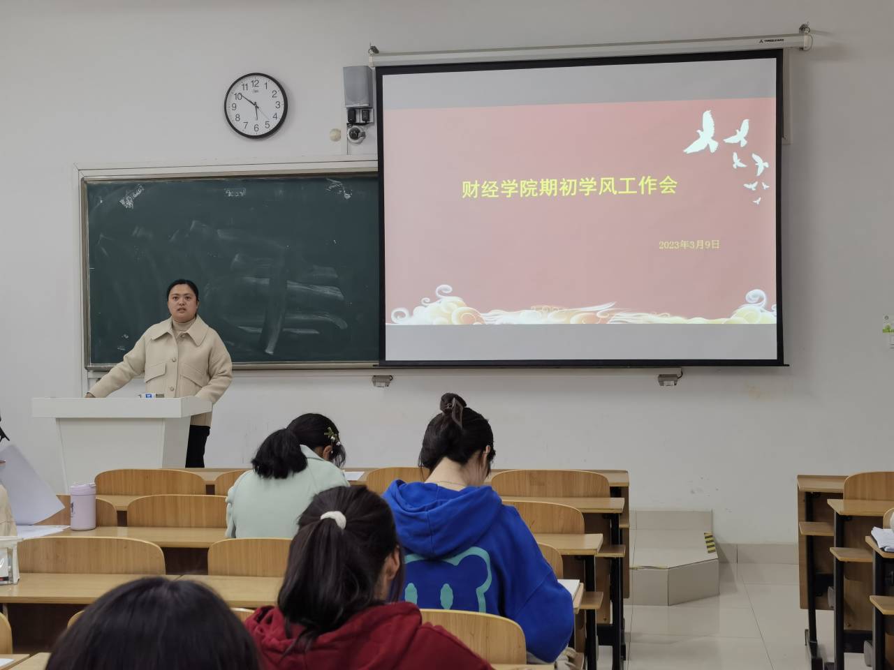 宣晶晶对本学期学风建设相关工作作了部署,重点围绕日常考勤、课堂学风督查、晚自习督查等几个方面。她要求学习委员做好班级同学与学院、教师之间沟通的桥梁,进一步严肃课堂考勤,与学院和任课教师形成工作合力,共同营造优良学风。