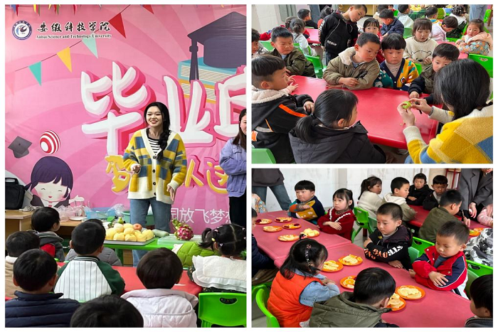 在活动现场,同学们首先向孩子们介绍了本次食品雕刻课堂的主要内容,现场摆放地果蔬雕刻作品和果蔬摆盘,极大地调动起了小朋友们的好奇心;随后李雯同学为孩子们现场展示月季花的雕刻工艺流程,并展示了孩子们喜爱的麻雀的雕刻过程,现场的孩子们积极参与,认真聆听,并不时提出他们关心的问题。随后,研究生分会的同学们利用现有的食材和工具,现场制作出精美的果蔬摆盘作品。小朋友们也跃跃欲试,在幼儿园老师的协助下,研究生分会的同学们耐心指导,让孩子们制作出他们自己喜欢的美食造型。最后,大家将制作好的成品果蔬拼盘和孩子们自己的作品放在一起,带领孩子们一起欣赏、品尝,让孩子们感受作品图案赏心悦目、新鲜美食可口美味。整个活动现场欢声笑语,其乐融融。