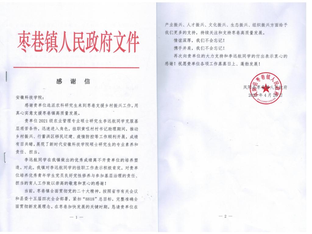 4月26日,一封来自凤阳县枣巷镇人民政府的感谢信寄到了我校,信中对管理学院2021级农业管理专业硕士研究生李远航同学提出了表扬。