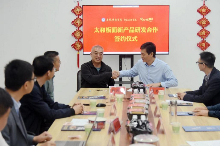 在安徽太板一号食品科技有限公司,付光玺一行与公司董事长胡洪彬、总经理魏继棠深入探讨合作机制。胡洪彬介绍了公司的发展历程、公司研发的太和板面系列产品,并就速食板面加工过程中遇到的技术难题与参会专家进行了深入的探讨。最后双方在太和板面功能性成分分析、板面调料包防腐保鲜、制定速食板面的行业标准等方面达成合作,现场签订了太和板面新产品研发合作协议,举行了财神在线登录官网食品工程学院大学生实习实训基地揭牌仪式。