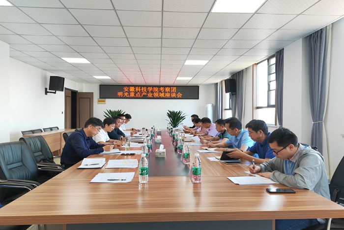 座谈会上,杨睿对陈丰一行的到来表示欢迎,并介绍了明光市情市况、科技创新以及人才发展等情况。陈丰简要介绍了我校科技创新以及产学研开展情况。陈丰指出,学校将紧紧围绕明光经济社会发展中的重大、关键技术难题,聚焦明光百亿产业发展需求,选派优秀教师和学生扎根明光,进一步开展联合攻关,为明光经济社会高质量发展提供更为有效的人才和智力支撑。双方围绕绿色涂料、凹凸棒基新材料、艾草及绿色食品等百亿产业以及科技成果转移转化中心建设、人员和物质保障等方面开展深入交流,并对战略合作协议内容进行了商讨。