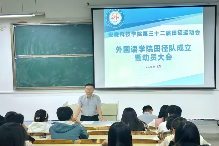 11月2日晚,外国语学院在求知楼A座102教室召开参加校第32届田径运动会田径队成立暨动员大会。外国语学院党委党政领导、有关教师、学院艺体中心干部及全体运动员参加会议,会议由专职辅导员张薇薇主持。