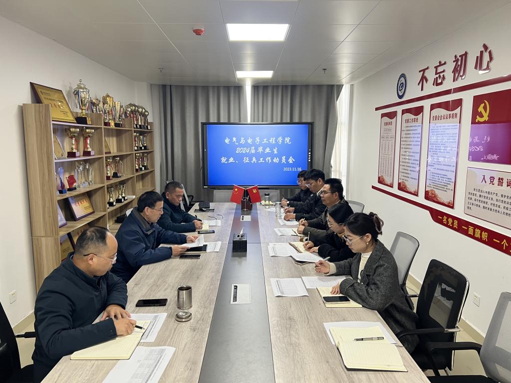 为做好2024届毕业生就业指导工作,切实提升毕业生就业质量,11月16日,电气与电子工程学院在西附楼308会议室召开2024届毕业生就业、征兵工作动员会。学院党委书记骆海邦,党委副书记、院长夏显明,党委副书记、纪委书记尚磊,毕业班辅导员及学院就业联系人参加会议。