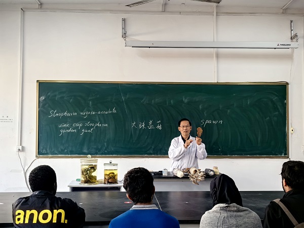 我校国家食用菌工程技术中心安徽食用菌技术推广基地负责人、安徽省食用菌技术协会副理事长何华奇教授为留学生进行了现场指导。他首先为留学生介绍了蘑菇种植培育基地的基本情况,带领留学生参观了菌种室、培菌室、出菇室,然后详细讲解蘑菇种植培育的理论知识。“纸上得来终觉浅,绝知此事要躬行”。国际学生在听取了何教授的报告后非常好奇,跃跃欲试,纷纷捋起袖子现场开始种植蘑菇,何教授手把手指导国际学生开展蘑菇种植活动。