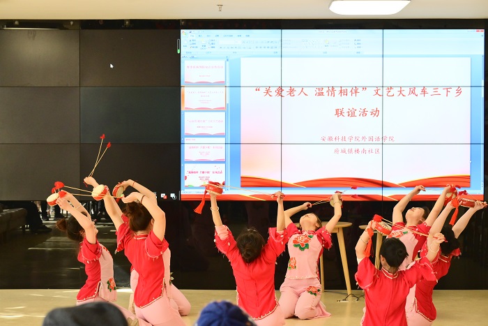 为弘扬敬老爱老的传统美德和志愿服务精神,展现新时代大学生的青春风采,3月22日下午,外国语学院文艺大风车艺术团在学院团委副书记宋兵兵带领下赴凤阳县福康养老院开展“关爱老人 温情相伴”活动,来自翻译专业学生党支部和英语学生党支部的党员和外国语学院艺术团55名学生参加。文艺汇演在养老院一楼大厅举行,凤阳县楼南社区党总支书记马长顺、团支部书记王丹丹以及养老院约120余人共同观看演出,文艺汇演由学院主持队队长任星月主持。