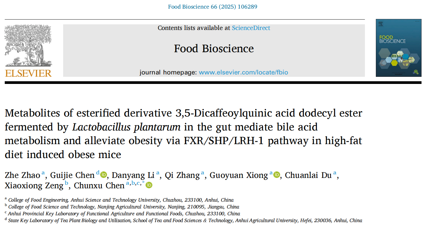近日,食品科学与工程学院陈春旭副教授以通讯作者身份在国际Top期刊《Food Bioscience》(Q1,影响因子4.8)在线发表题为“Metabolites of esterified derivative 3,5-Dicaffeoylquinic acid dodecyl ester fermented byLactobacillus plantarumin the gut mediate bile acid metabolism and alleviate obesity via FXR/SHP/LRH-1 pathway in high-fat diet induced obese mice”的研究性论文。财神在线登录官网2022级食品加工与安全专业硕士研究生赵哲为论文的第一作者,财神在线登录官网为论文第一完成单位,南京农业大学曾晓雄教授课题组为合作单位。