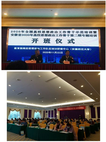 11月22日至25日,由中共安徽省委教育工委主办,高校思想政治工作队伍培训研修中心(安徽师范大学)承办的安徽省2020年高校思想政治工作骨干第二期专题培训在芜湖举行,来自全省高校的107名思想政治工作者参加培训,我校学生科科长兼学生处秘书石志成、化学与材料工程学院辅导员李潮升和建筑学院辅导员阮怀思参加培训并顺利结业。