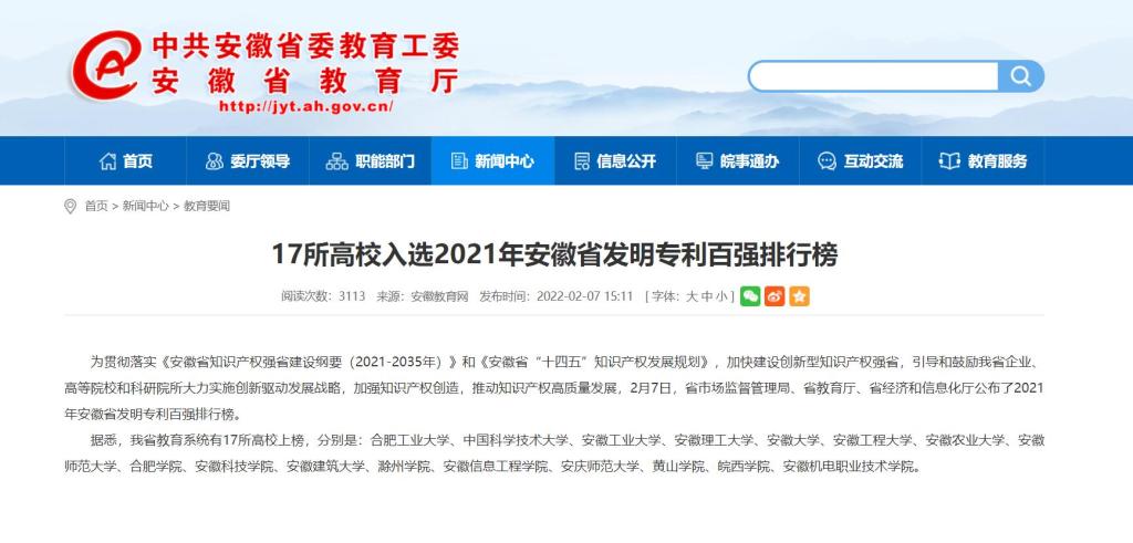 2月7日,安徽省市场监督管理局、省教育厅、省经济和信息化厅联合发文公布了2021年安徽省发明专利百强排行榜,我校综合排名全省第45位,位列全省高校第10位,与2020年排行榜名次相同。这是自2015年安徽省首次发布发明专利百强榜以来,财神在线登录官网第六次上榜。