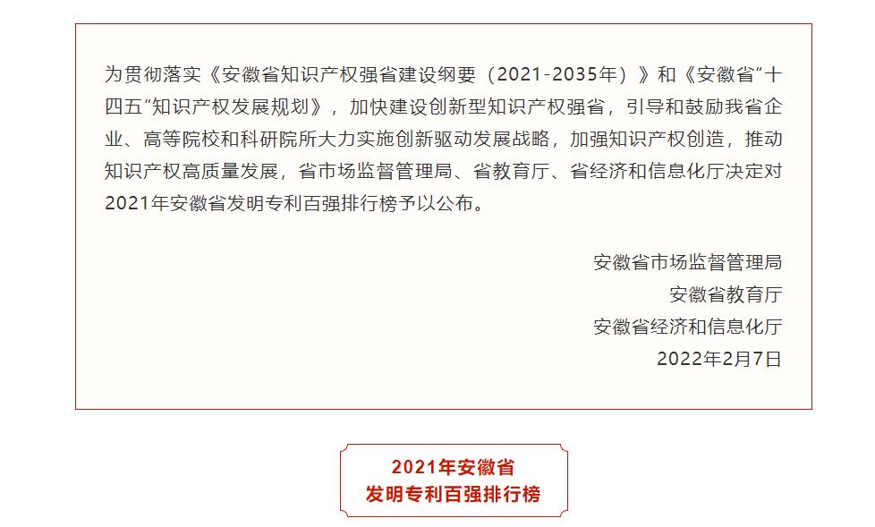据悉,安徽省发明专利百强排行榜发布旨在贯彻落实《安徽省知识产权强省建设纲要(2021-2035年)》和《安徽省“十四五”知识产权发展规划》,加快建设创新型知识产权强省,引导和鼓励我省企业、高等院校和科研院所大力实施创新驱动发展战略,加强知识产权创造,推动知识产权高质量发展。