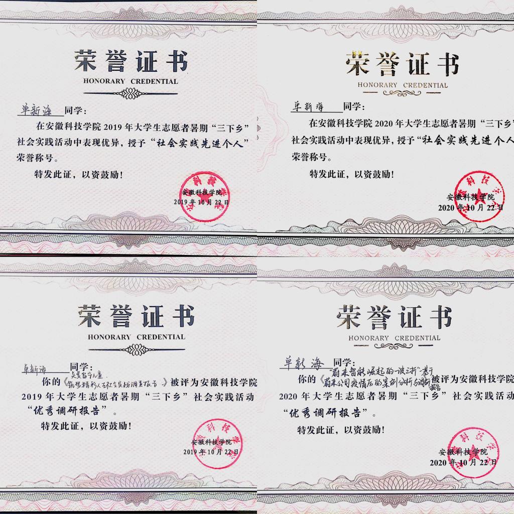 单新海注重大学生道德榜样的树立,用身边事教育身边人,充分发挥榜样的力量,自新冠肺炎疫情发生以来,积极响应学校号召,挺身而出,在全国疫情防控大形势下,单新海根据自身所在地区的特点进行2020年大学生创新创业项目的申报-《新冠疫情对合肥市农村地区基层治理的挑战与应对研究》,获国家级大创项目立项。其内容是通过调查合肥市地区乡村基层治理现状,归纳、实证分析新冠疫情对合肥市农村地区治理的挑战。探讨国外典型国家农村治理问题的一系列经验和教训,总结先进典型,获取典型做法,并提出新冠疫情对合肥市农村地区基层治理挑战的应对策略。