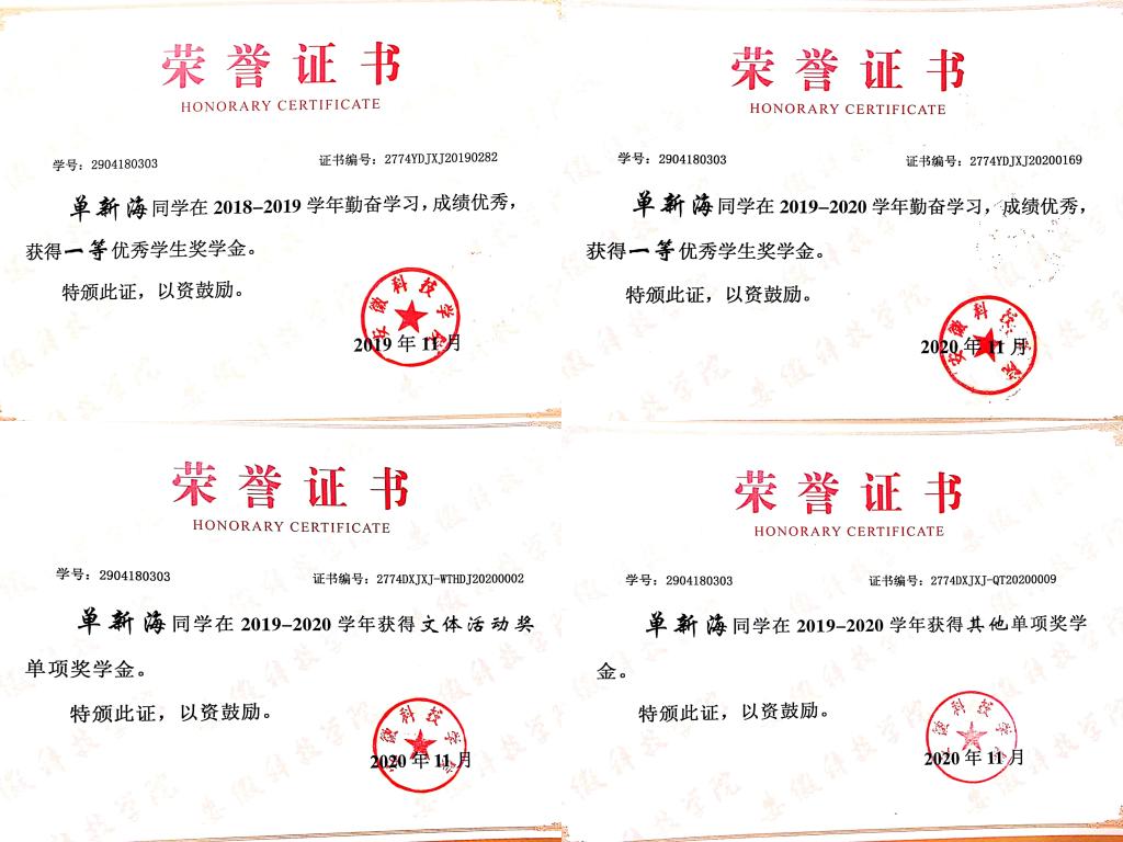 单新海父亲患有脑梗死、母亲腰间盘突出,腿部手术,家境贫寒加上自身心脏不好让他的求学之路比普通人更加艰辛,但是他仍不放弃学业,以乐观积极的态度面对挫折,克服重重困难,实现大学梦,大学入学至今,单新海连续两年获得专业双第一以及校一等优秀学生奖学金,校三好学生等荣誉,更是于2019年获得国家励志奖学金,2020年获得国家奖学金,为身边同学树立了模范作用。