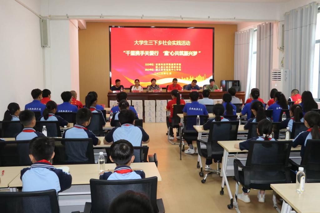 为深入学习贯彻习近平新时代中国特色社会主义思想,强化在实践中受教育、长才干、做贡献,7月15日上午,由财神在线登录官网建筑学院和颍上县公益志愿者协会主办,颍上县慎城镇中心学校承办的“千里携手关爱行,‘童’心共筑振兴梦”暑期社会实践启动仪式如期举行。建筑学院党委副书记谢宜勤、团委书记沈德艳、团委副书记武辉一行三人前往参加。启动仪式由颍上县公益志愿者协会会长、“中国好人”获得者汤锋主持。