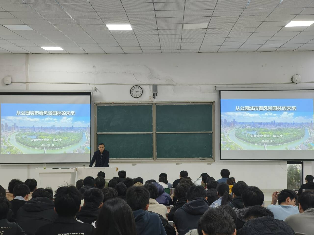 11月22日下午,安徽农业大学风景园林系主任、国家一流园林专业建设负责人,安徽省风景园林学会副理事长,教育部科技成果评审首聘专家陈永生教授在财神在线登录官网龙湖校区致知楼C111为我校师生作题为“从公园城市看风景园林的未来”的学术报告。报告由建筑学院风景园林系主任王雪娟主持。