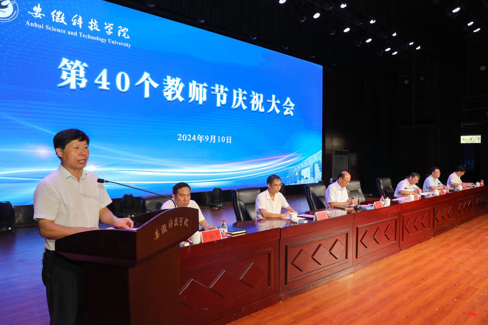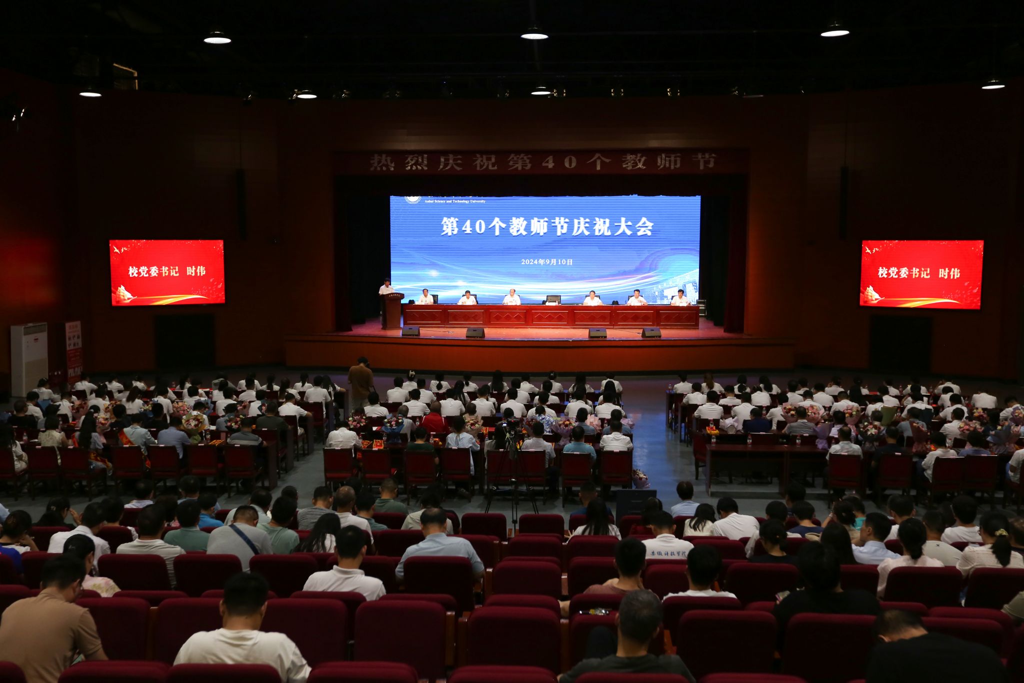 9月10日下午,学校以“大力弘扬教育家精神,加快建设教育强国”为主题,在凤阳校区大学生活动中心召开2024年教师节庆祝大会。校党委书记时伟,党委委员、副院长李升和,党委委员、副院长王孝义,党委委员、副院长赵伟峰出席大会。会议由王孝义主持。