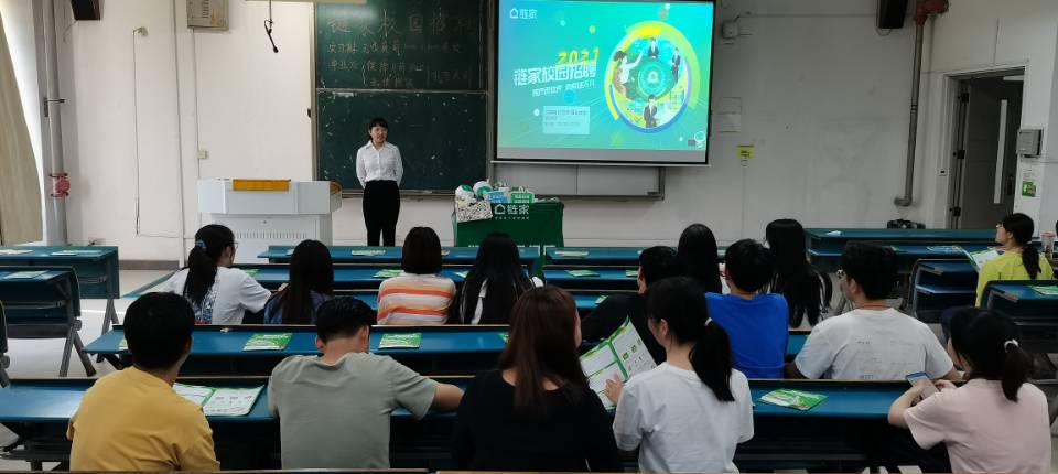 宣讲会上,刘洋首先为同学们播放了公司的宣传片,随后通过视频和PPT等材料向同学们详细的介绍了链家的业务范围、经营模式、发展历程和发展规划等,并从公司简介、企业文化、薪酬构成、需求岗位、任职要求等方面带领在场同学了解了当今招聘市场的行情与招聘信息,讲解了人才发展通道、企业文化和经营理念等相关内容。招聘现场气氛活跃,积极咨询职业房产经济人的薪资以及职业前景情况。