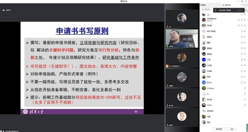 为提升2023年度国家自然科学基金申报质量,生命与健康科学学院邀请清华大学闫利明,于1月13日上午通过腾讯会议,为学院做了国家自然科学基金申报辅导报告。学院副院长钱立生主持报告会,学院20余位教师在线上聆听了辅导报告。