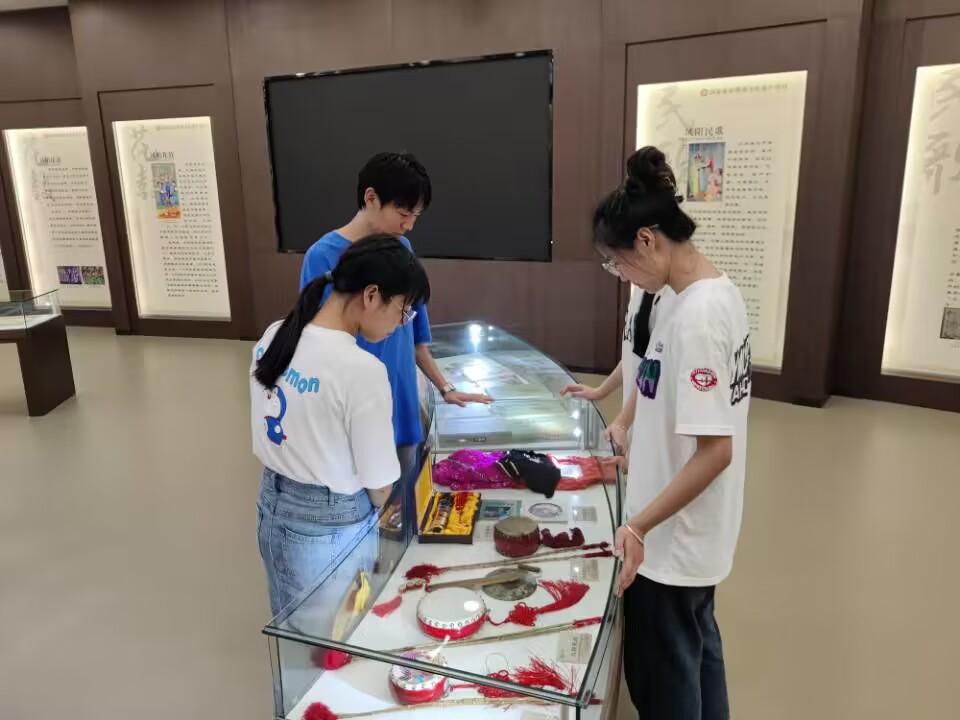 凤阳县文化馆是全县群众文化活动的主要基地,馆内展有各级各类非遗传统项目与宝贵文物。在本次实践活动中,团队成员们认真了解文化习俗,用心学习传统技艺,亲身感受艺术的魅力。团队成员们积极参与展馆文化活动的策划和推广工作,协助组织方开展相关的宣传活动。在众多非遗项目中,最具代表性的就是凤阳花鼓和民歌。花鼓是凤阳县独特的表演形式,融合了舞蹈、音乐和戏剧等元素,展现了浓厚的乡土气息。团队以调研的方式深入了解凤阳县非物质文化遗产花鼓和民歌的保护和传承情况,通过采访当地文化传承人、艺术家或相关专家,了解他们的经验和故事,并借助各类平台,积极推广传播,以达到良好的宣传效果。本次活动还邀请到著名的花鼓演艺团队,为参观团队带来精彩的演出,成员们近距离欣赏花鼓演奏的精湛技艺,感受其中蕴含的文化底蕴。非物质文化遗产是一个民族乃至国家历史文化的主要载体,被誉为“民族记忆的背影”。