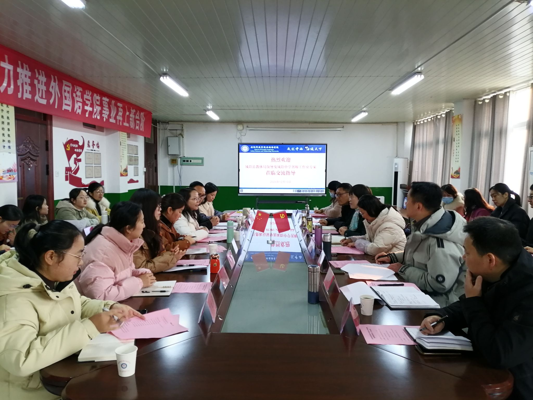 为进一步推动校地协同育人发展进程,构建大中小学外语协同育人机制,巩固专业认证成效,12月13日,外国语学院农村基础英语教育与教师发展团队在学院会议室举办了教育科学课题申报专题研讨会。外国语学院院长刘萍、副院长邓兆红、副院长洪民、农村英语教育与教师发展科研团队负责人詹先君教授及全体成员,凤阳县教育体育局教研员范林红、安徽省凤阳中学教师孙乃珠及凤阳县孙乃珠名师工作室全体成员,共同参加了本次研讨会。会议由刘萍主持。