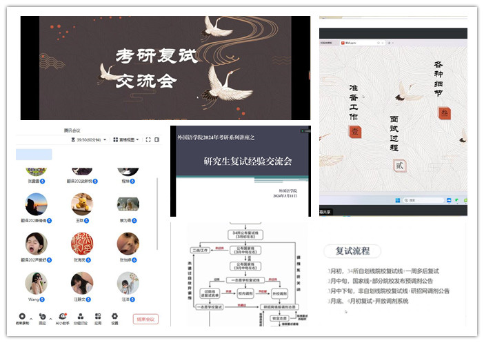 近期全国硕士研究生入学考试成绩陆续公布,为帮助考研学生明晰复试程序及准备方向,3月11日晚,外国语学院线上组织了2024年考研复试经验交流会。会议邀请来自浙江财经大学、青岛大学的往届优秀毕业生张露露、凤莎作经验交流,学院党委书记蔡为青、副书记张海亮以及2024届、2025届对考研感兴趣的学生参加了交流会,会议由学院党政办主任陈慧中主持。