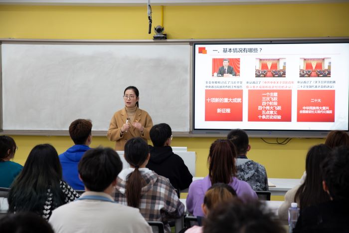 2021年以来,赵仁青老师在校内面向全体青年大学生,开展了多场次丰富多彩的以党史教育为重点的“四史”宣传宣讲示范活动。这些活动主要有:二级学院党员、入党积极分子参加的“党课来啦”;校团委的“青年党史学习微讲堂”、“青马工程”大学习;学生处的“学习讲坛”、易班“易学习”等。在2021年七一前夕,赵老师受安徽省教育厅邀请参加全省大中小学生“同上一堂‘党史’大课”宣讲,她和其他四位专家的共同精彩授课,在全省教育领域引发了强烈反响,线上线下累计观看人次超过900万。在城市,在乡村;在小学,在高中,在大学;在教室,在宿舍,在学校礼堂……全省大中小学的师生们一起学习党史,从中国共产党人的精神谱系中汲取智慧和力量。2022年,赵老师又积极参与了我校与凤阳县党的二十大精神系列宣讲活动,精彩授课获得了大家的一致好评。(特约通讯员:盛青广 摄影:李澜清 杨文俊 审核:姚文均 编辑:陈晋)