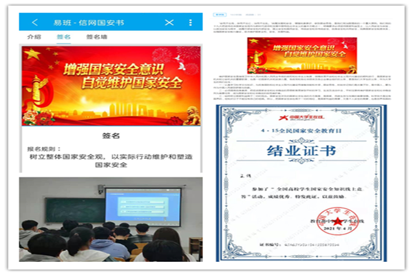 学院以“千万师生同上一堂国家安全教育课”为活动载体,以班级安全教育主题团日活动为主要形式,采用组织观看《树立总体国家安全观,以实际行动维护和塑造国家安全》线上公开课等方式,深入学习了解国家安全法律以及公民维护祖国的安全、荣誉和利益的基本义务,提升维护国家安全的自觉性和主动性。此外,各班级还通过易班进行主题宣传展示、知识竞赛、安全承诺、学生国家安全素养学习展示等创新型活动,订阅“中国大学生在线” 微信公众号参与“全国高校学生国家安全知识线上竞答”,并取得了中国大学生在线颁发的学习证书。