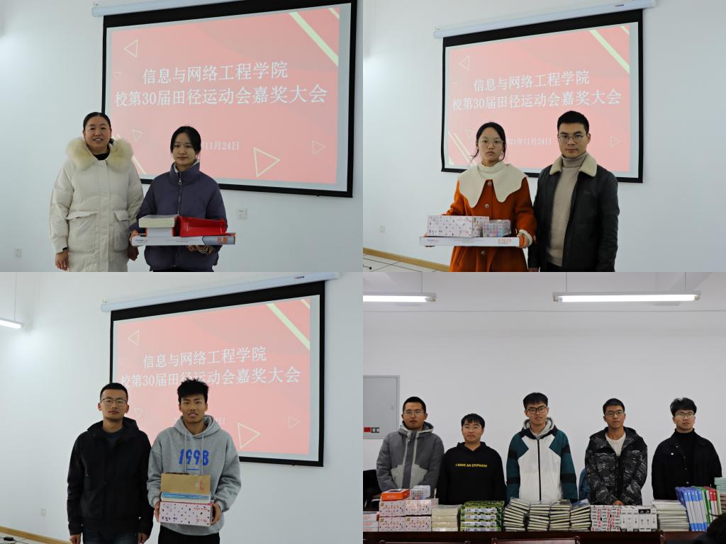 11月24日中午,信息与网络工程学院在尚行楼B418召开了校第三十届田径运动会表彰大会。学院党委副书记韦乃学,专职辅导员陈凯、李军成、丁阿敏、崔北坤出席了本次大会,运动员代表和学生干部代表参加本次大会,大会由崔北坤主持。