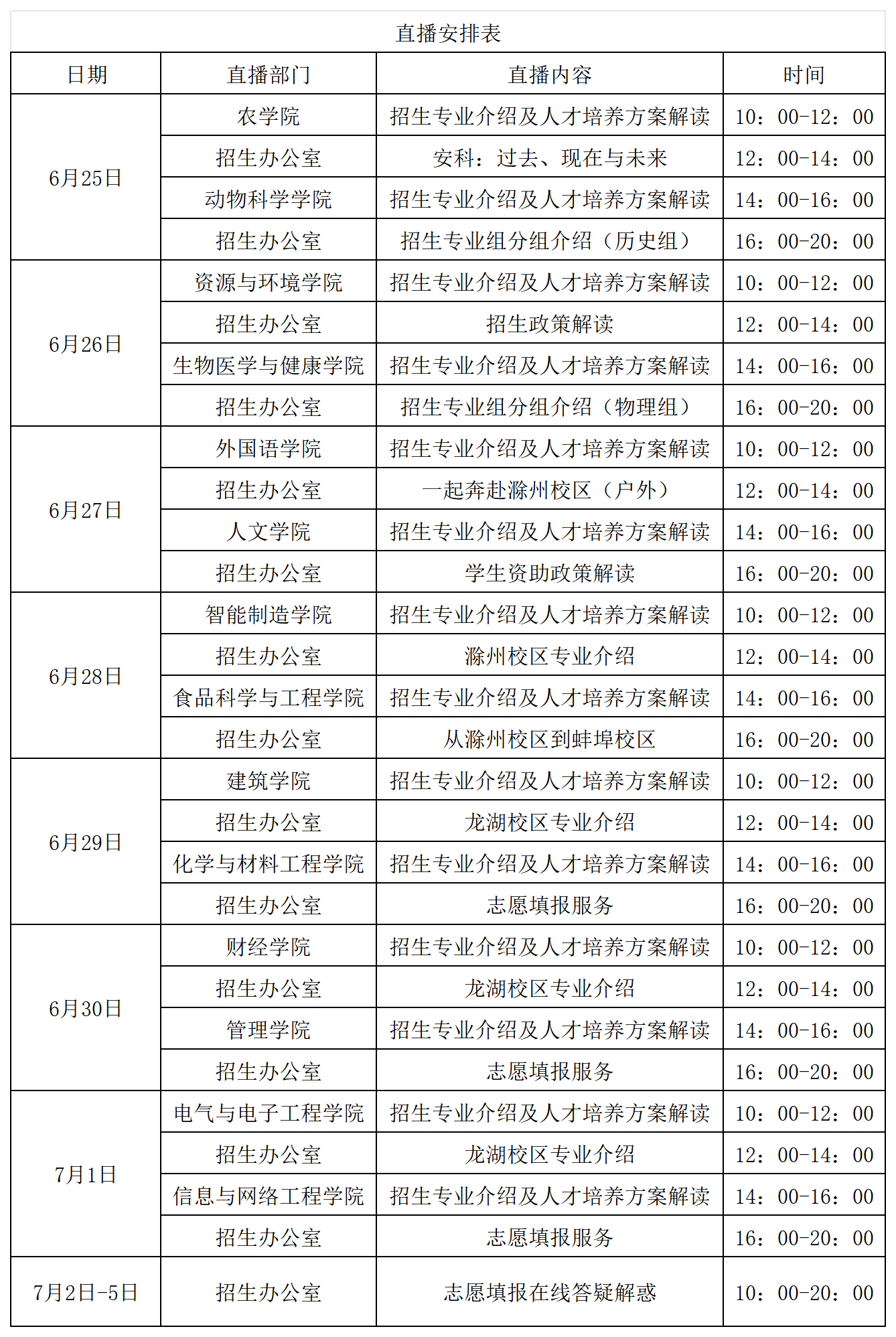 2.安徽高招咨询平台:6月25日—7月7日每天9:00-18:00期间,安徽省教育考试院网上咨询平台“安徽省高招咨询平台”在线答疑,网址:http://gaokao.ahjyzx.cn/。