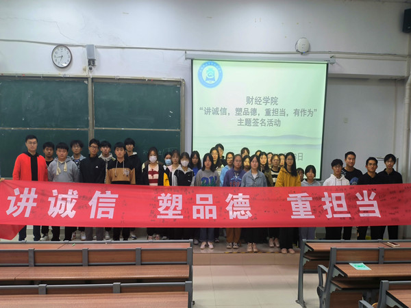 无规矩不成方圆,无品德不成大器,无担当则无以有为。为让广大新生深入了解校规校纪,树立良好的诚信品德,塑造健全人格,争做新时代“四有”大学生,10月28日晚,财经学院在龙湖校区致知楼C111开展“立规矩、塑品德、重担当、有作为”主题教育签名活动。2022级新生班级全体班委参与。签名活动由辅导员尹成超主持。