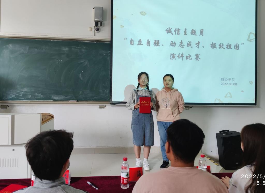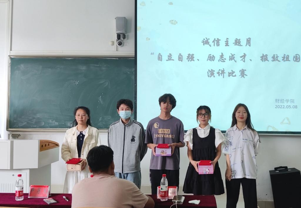 为大力宣传国家资助政策,弘扬受资助学生成长成才先进事迹,引导激励广大学生刻苦学习、锐意进取、自立自强、感恩奉献,5月8日下午,财经学院在龙湖校区致知楼A108教室举办“至诚则成,立信于行”主题演讲比赛。学院正科级辅导员宣晶晶老师出席并观看了比赛。学院体育发展中心负责人武海、大学生艺术发展中心卢子文和权益维护部彭楠楠等三位同学受邀担任评委。比赛由朱晓璐、辛远洋主持。