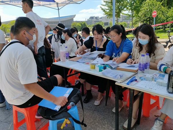 在迎新现场,研究生党员们佩戴党员徽章,奔走在迎新的第一线。党员们带领新生参加疫情检测,引导新生到学院的报到点,帮助新生搬运行李,介绍学校的环境及学习情况,协助他们尽快了解和适应学校环境。