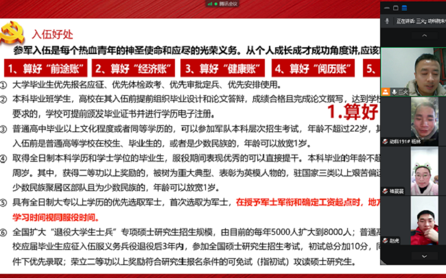 为全面做好2023年春季大学生征兵宣传动员工作,鼓励毕业生积极应征入伍,1月3日,动物科学学院线上召开2023届毕业生征兵宣传动员会。会议由学院征兵联系人李焱主讲,2023届毕业班各班班委参加会议。