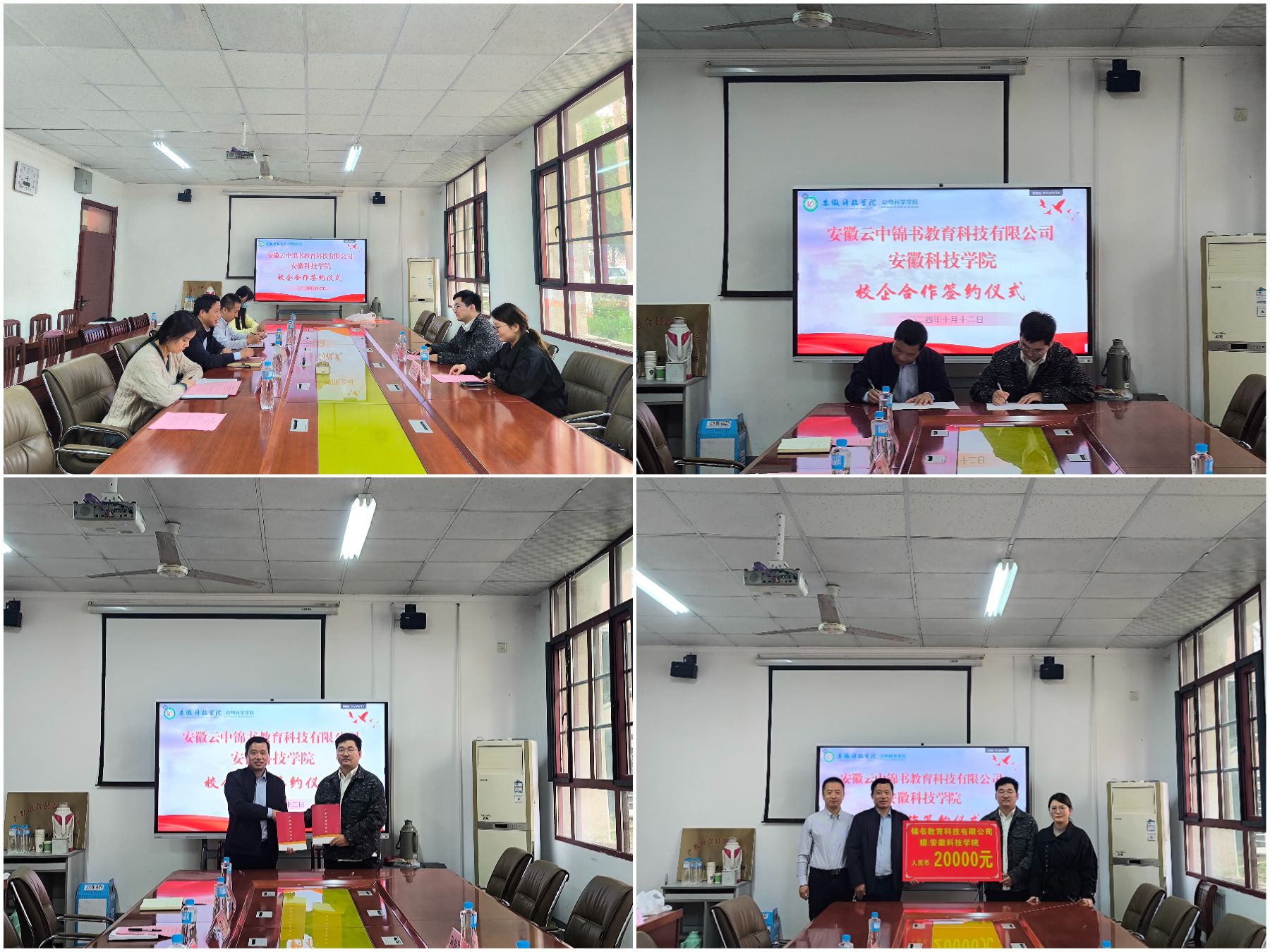 为提高人才培养质量,推动教育资源与行业需求相匹配,10月12日上午,我校与安徽云中锦书教育科技有限公司在西办公楼104会议室举行校企合作签约仪式,动物科学学院党委书记程斌,团委书记李焱,安徽云中锦书教育科技有限公司法人代表、动物科学学院2020届校友孙越洋等人出席此次活动。