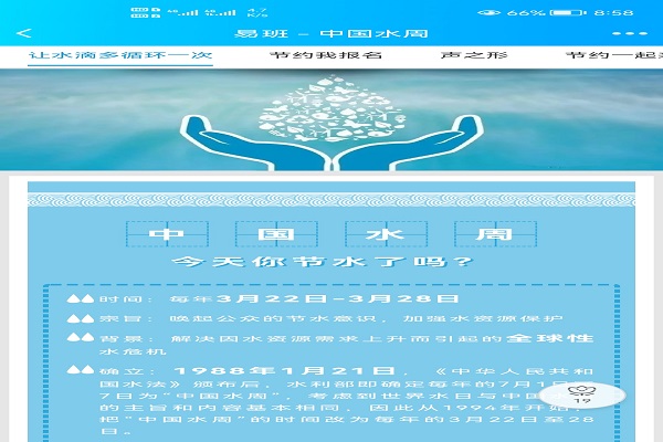 “中国水周”主题活动分为“让水滴多循环一次”、“节约我报名”、“声之形”三个模块,旨在普及《中华人民共和国水法》的来源与颁布的依据,强调节约用水的重要性和必要性,呼吁广大同学珍惜水资源。