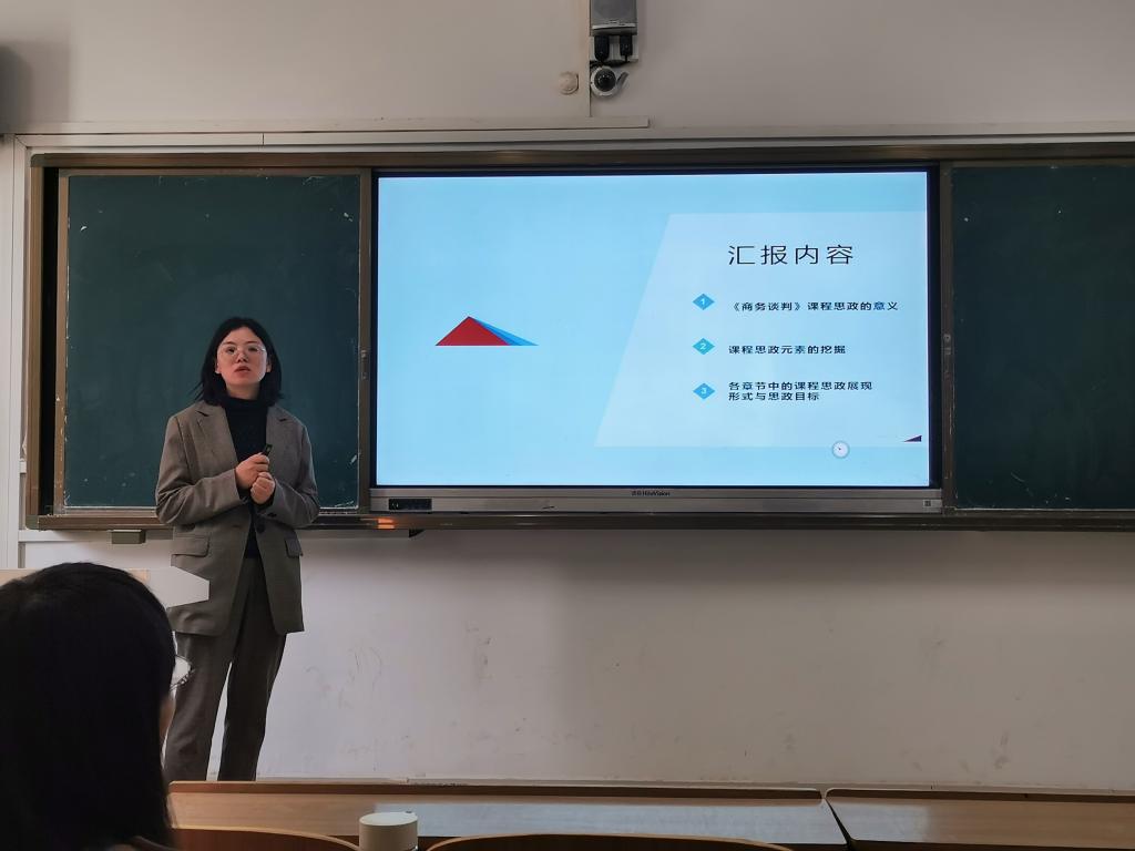 窦佳丽老师从《商务谈判》课程思政的意义、课程思政元素的挖掘和课程思政展现形式与思政目标进行了汇报。在课程思政意义方面,《商务谈判》是营销类专业核心课,对学生的职业生涯起着重要的意义,商贸活动的专业性、利益性、全球化特点,容易使学生在其过程中产生道德困惑、价值选择与判断不准,也会迷失自我,价值观的弯曲,教师需冲破以往教授单一理论知识点的方式,在课堂这第一道防线上“立德树人”。在思政挖掘方面,从引导学生坚定理想信念、厚植爱国主义情怀、加强品德修养、增长知识见识、培养奋斗精神、增强综合素养等角度进行挖掘,并通过模拟谈判培养爱国主义情怀、大局意识、社会主义核心价值观、团队精神等。在课程思政展现形式与目标方面,以“第一章商务谈判概述”“第二章商务谈判类型与内容”为例进行了详细演示。