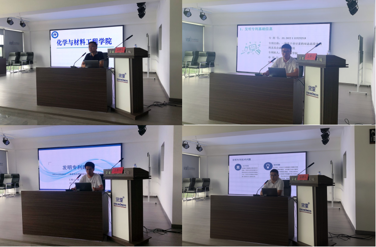 活动中,周永生代表学院学科团队向与会嘉宾做了介绍。四位老师则分别做了“一种高硼硅防火钢化玻璃及其钢化方法”、“一种基于香豆素的双态高荧光材料及其合成方法和应用”、“一种柔性石墨烯硅氧碳复合电极膜的制备方法”和“一种多刺激响应型材料及其制备方法和应用”等专利技术路演。