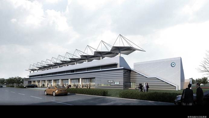 田径场看台建筑总面积3117平方米,共两层。位于整个校园用地西南角,风雨操场西侧。主要功能为3038座的看台及看台下方看台配套功能用房。功能布置紧凑,交通流线清晰。