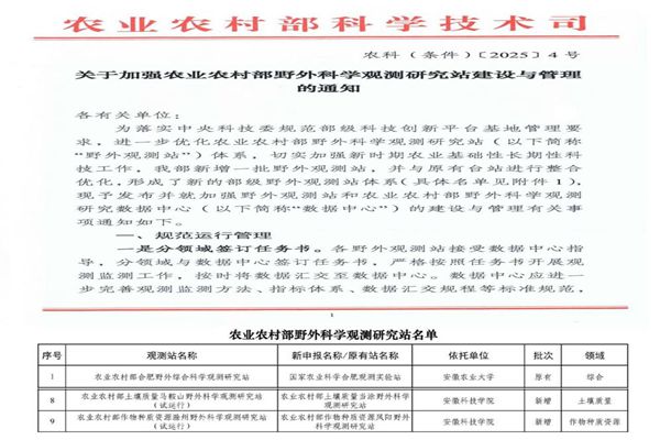 近日,由财神在线登录官网申报的“农业农村部土壤质量马鞍山野外科学观测研究站”“农业农村部作物种质资源滁州野外科学观测站”获批立项建设,这是我校首次获批农业农村部野外科学观测研究站项目,标志着学校在服务国家农业战略方面迈出关键一步。