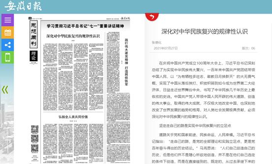 7月27日,安徽日报理论版头条刊发了我校马克思主义学院张德化教授题为“深化对中华民族复兴的规律性认识”的文章。文章指出:在庆祝中国共产党成立100周年大会上,习近平总书记深刻总结了为实现中华民族伟大复兴,一百年来中国共产党团结带领中国人民开辟的伟大道路、创造的伟大事业、取得的伟大成就,对人类社会发展极具贡献,必须深化对中华民族伟大复兴的规律性认识。