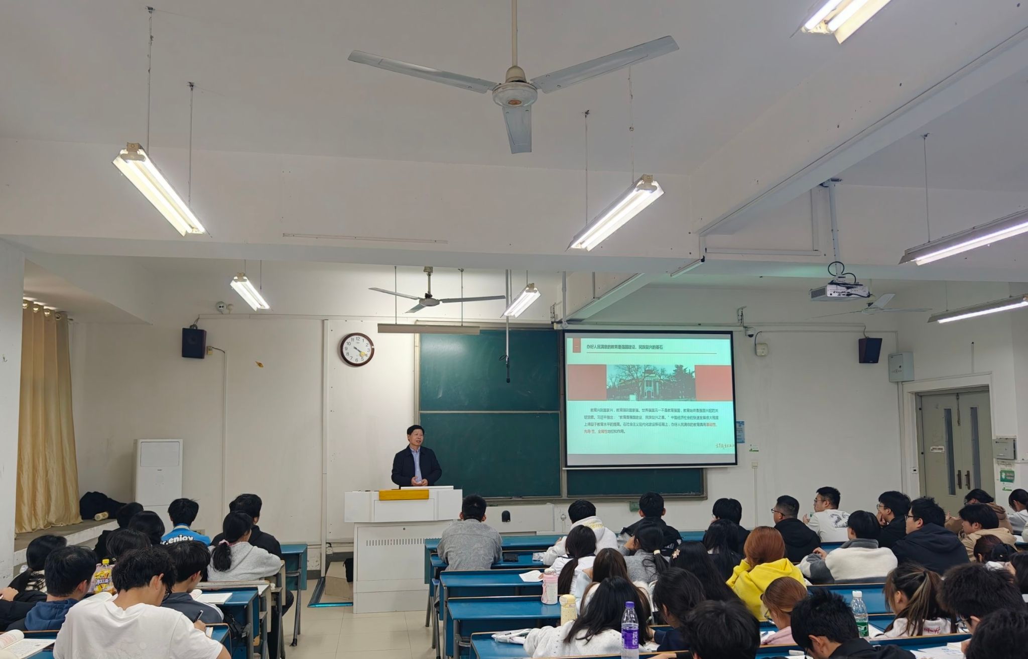 课堂上,时伟围绕“办好人民满意的教育”这一专题,结合党的二十大和二十届三中、四中全会精神,从历史逻辑、理论逻辑和实践逻辑三个方面,运用大量翔实数据,深入讲授教育是民族振兴和社会进步的基石,教育兴则国家兴、教育强则国家强,激发学生共同探索如何建设教育强国,引导青年学生立报国强国大志向、做挺膺担当奋斗者。