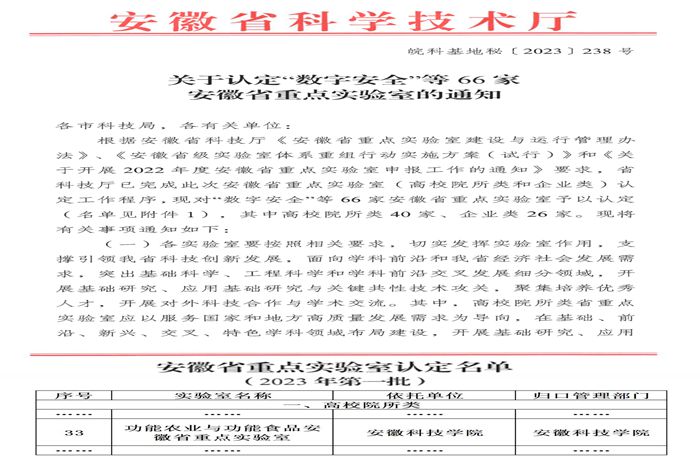 近日,安徽省科学技术厅下达了《关于认定“数字安全”等66家安徽省重点实验室的通知(皖科基地秘〔2023〕238号)》,财神在线登录官网与合肥工业大学、安徽农业大学合作申报的“功能农业与功能食品安徽省重点实验室”成功获得认定,财神在线登录官网长三角功能农业(食品)研究院院长尹雪斌教授担任实验室主任。据悉,这是我国首个融合了功能农业与功能食品完整“创新链”的省级重点实验室。