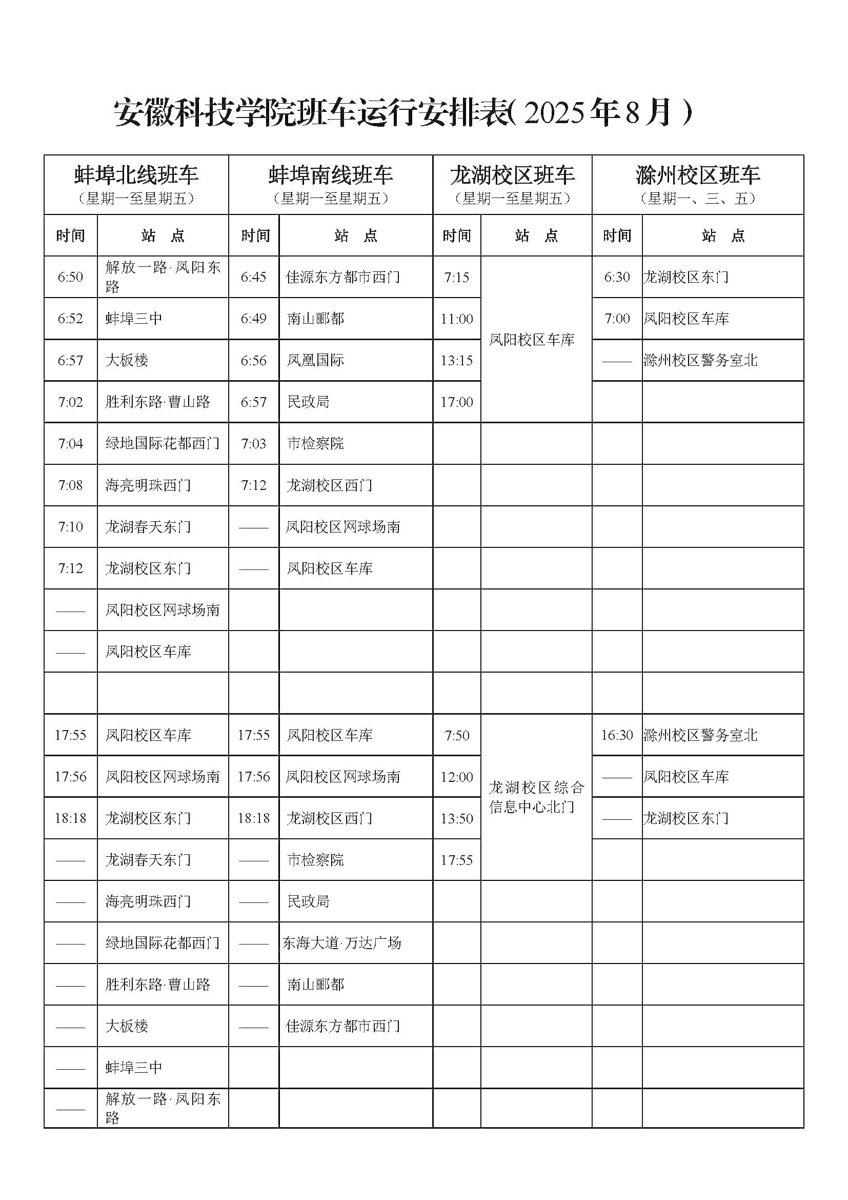 (二)滁州校区班车各站点按《财神在线登录官网班车运行安排表(2025年8月)》早晚各推迟30分钟发车;