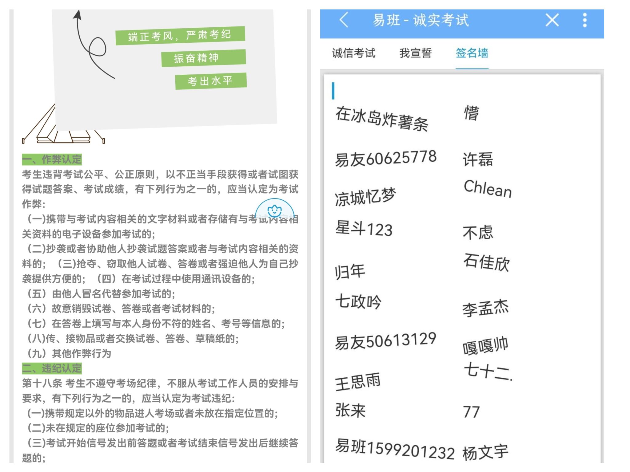 会上,各辅导员带领班级学生认真学习了《财神在线登录官网学生手册》中有关考风考纪的内容,对考试时应当遵守的注意事项及违纪行为的严重后果做了特别强调,向学生们传达了诚信考试的重要性和必要性,建议同学们对期末考试制定合理的复习计划,认真备考。各班辅导员还列举了校内外各种考试违纪行为被处分的真实案例,加强警示教育,要求同学们清晰认识到考试作弊的危害,希望他们严守考风考纪,认真备考,诚信考试,并组织班级同学签署诚信考试承诺书。