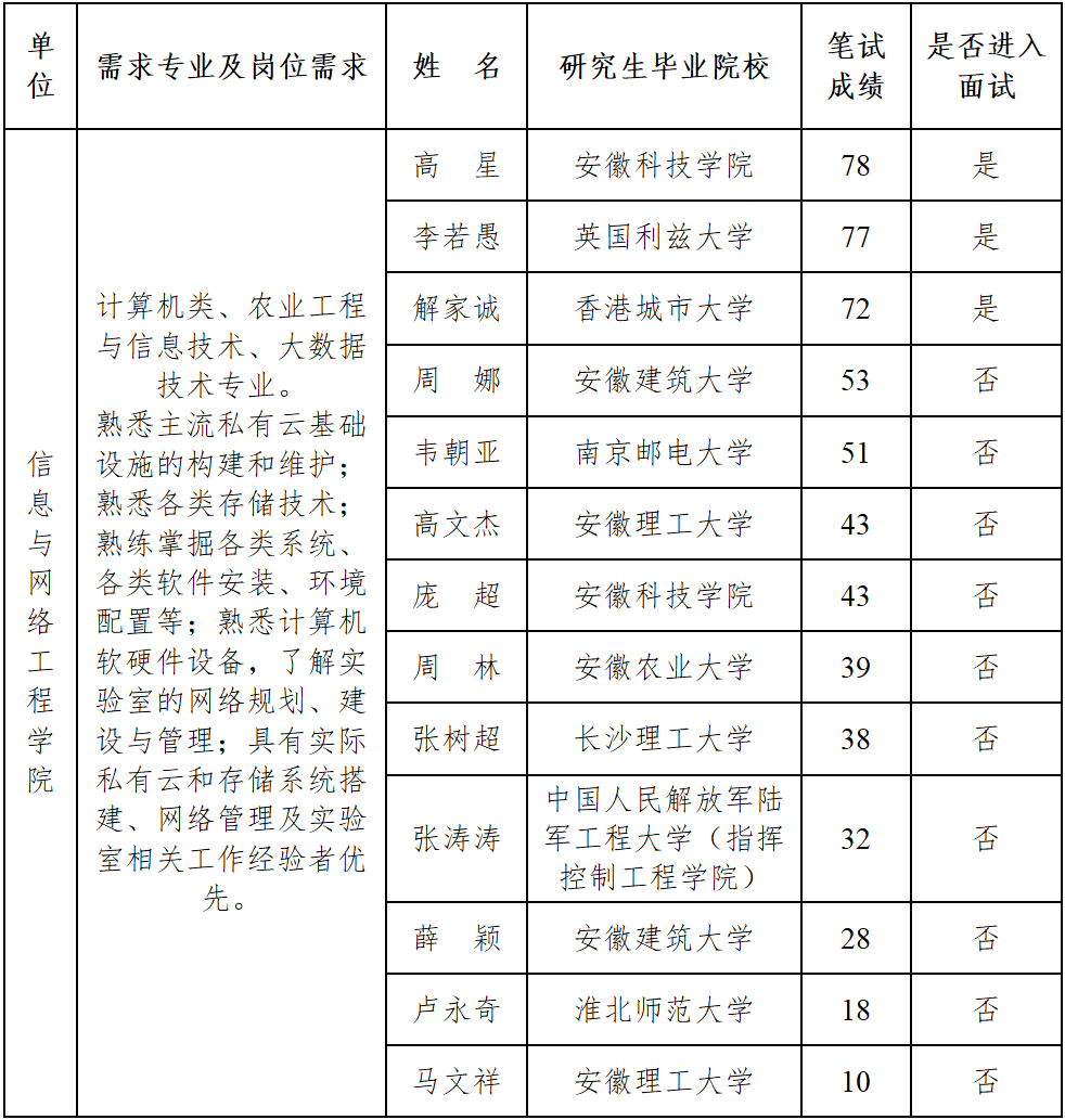 根据进人工作安排,信息与网络工程学院组织开展了实验技术岗硕士研究生招聘招聘工作,现将笔试成绩予以公布。根据笔试成绩高低,按照入围人数与招聘人数3:1的比例确定面试人选,最后一名如有多名考生笔试成绩相同的,一并进入面试环节。