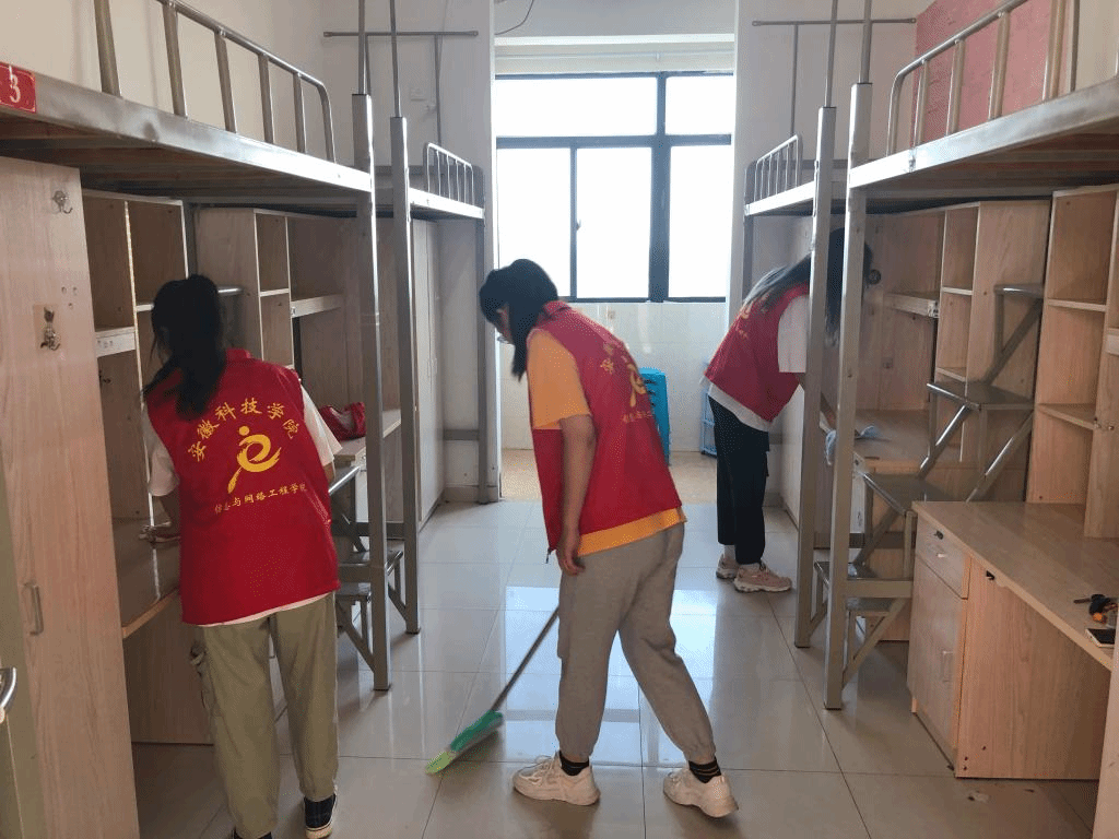 活动由学生党支部书记陈凯、李军成、崔北坤老师带队,深入新生宿舍,逐一清查规整新生宿舍,检查设施,打扫卫生。大家分工明确,热情积极,不怕脏,不怕累,不放过任何卫生死角,以饱满的热情和爱心,共同创造干净整洁舒适的住宿环境。