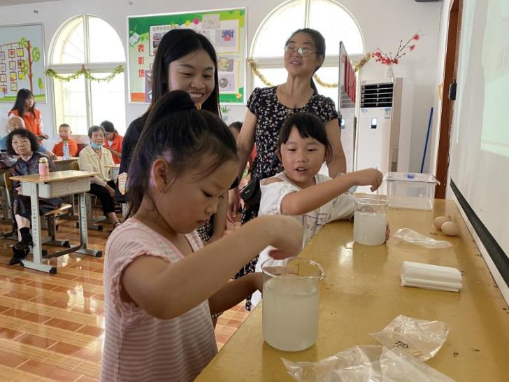 (图6 博士团志愿者与社工站的孩子们开展盐水漂浮实验)